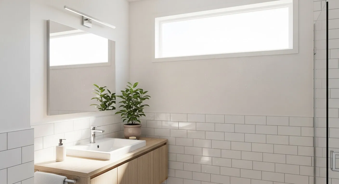 A bright, clean bathroom with white tiles, sunlight coming through the window, and a small green plant on the counter looks and feels so much better. You can make your bathroom smell that fresh again too.