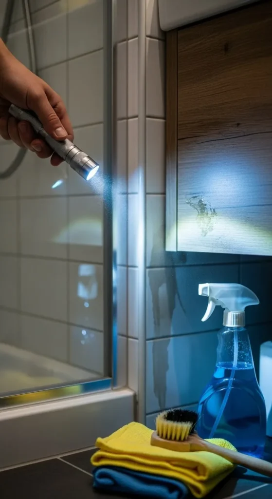 A person using a small flashlight to check under the sink and along tile corners can help spot hidden mold. Once you find where the smell is coming from, you can clean that area properly.