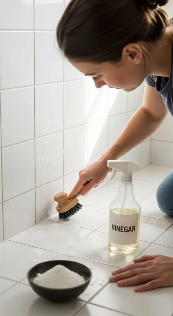 - Mix baking soda and water into a paste and scrub the grout or corners.