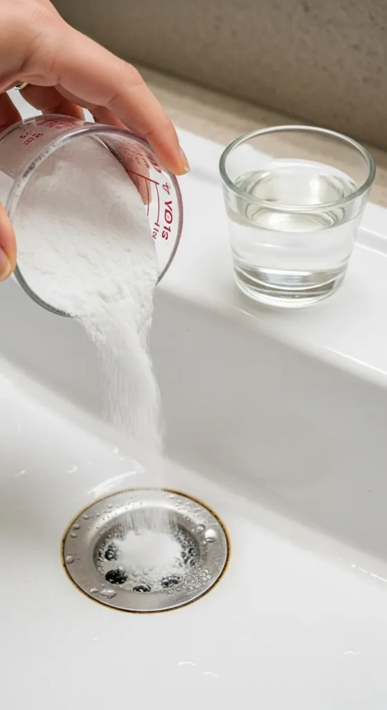 A person pouring baking soda into a sink drain with bubbles forming is exactly what this looks like. Doing this once a week helps keep your bathroom smelling clean.