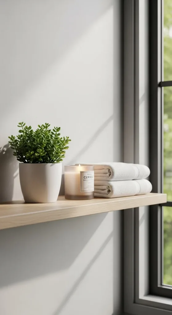 A bathroom shelf with a plant, candle, and folded towels near a window looks calm and clean and that’s exactly what good ventilation can do.