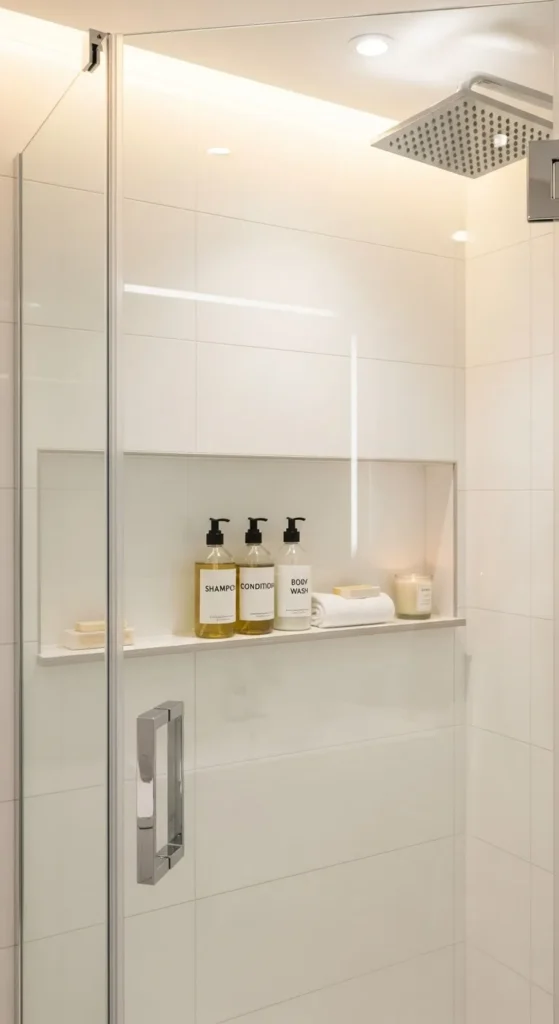 A sparkling shower with dry shelves and organized bottles shows that a little care can keep your bathroom clean and healthy for longer.